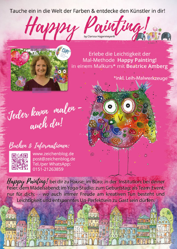 Am 2.7. geht es ins Freie: Malen im Brahmsgarten unter dem Motto "Happy Paiting! Es grünt so grün..." Happy Painting! Kurse dürfen aber auch in anderen Umgebungen und zu anderen Zeiten statt finden. Wenn du also eine Idee hast, oder ein Event planst, frage gerne bei Beatrice an. Vielleicht hast du einen Mädelstag geplant oder möchtest etwas Besonderes in deinem Geschäft anbieten .. wie auch immer, das Happy Painting! Credo lautet "Malen kann jeder - auch du!" Übrigens: Als ganz besonderes Geschenk gibt es den Happy B-Day-Malkurs. Ein Komplett-1:1-Malkurs bei dem zwei Stunden gemalt wird und hochwertiges Malmaterial, liebevoll als Geschenk verpackt, plus einer süssen Geburtstagsüberraschung inklusiv ist. Alle Informationen zu den verschiedenen Malkursen und Buchungsmöglichkeiten findest du auf www.zeichenblog.de/shop - schau einfach im Bereich Malkurse in Schongau. Oder du schreibst einfach an Beatrice via post@zeichenblog.de, wenn du Fragen hast. Falls du mehr über Happy Painting! und die Kurse von Beatrice nachlesen magst, lade dir hier gerne den Info-Flyer (PDF) herunter |